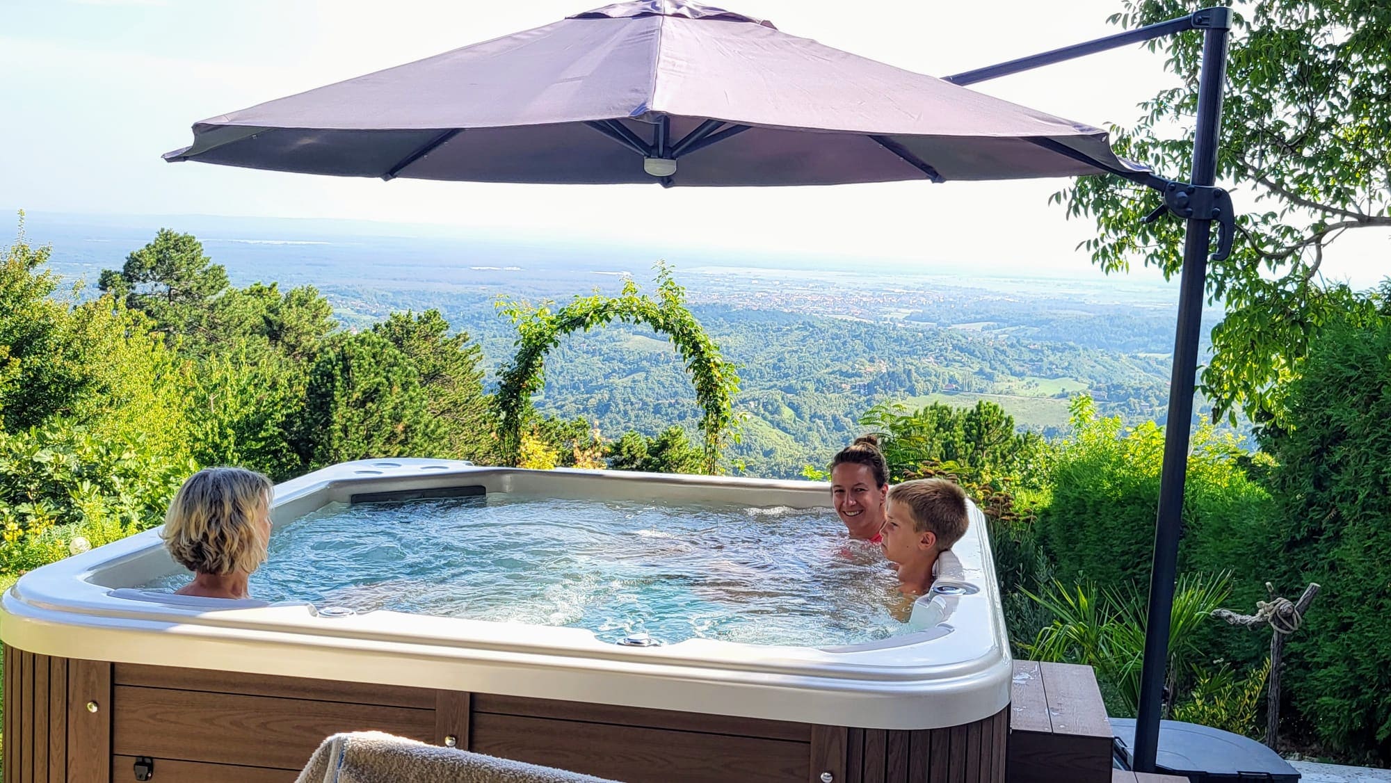 Fotografija savršeno prenosi atmosferu zajedništva i opuštanja u prirodi. U kadru se spajaju tri generacije, prekrasan pogled na zelene brežuljke Plešivice i hidromasažni bazen Glacia koji postaje središnje mjesto druženja. Topli tonovi, prirodna svjetlost i spontani osmijesi stvaraju prizor koji utjelovljuje ono što Canadian Spa predstavlja – trenutke mira, povezanosti i istinskog uživanja s najbližima.